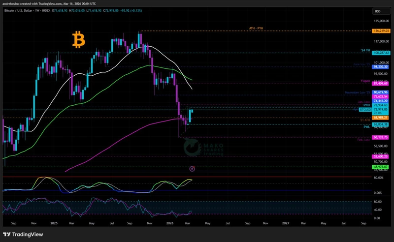 A Bitcoin 72,8 ezer dollárról indítja a hetet! A bullok minden olyan erősségre utaló jelre figyelnek, amely visszavezethet az 80 ezer dolláros zónába, míg a bearok addig nyugodtak maradnak, amíg a BTC a legfontosabb, magasabb időkeretű szintek alatt mozog, amelyek továbbra is korlátozzák az árat. Sikerül-e végre a bikáknak áttörni azt a falat, amely folyamatosan visszaveri őket, és megteremteni a feltételeket egy emelkedéshez, vagy a medvék ismét kihasználják-e a szintek körüli gyengeséget, hogy visszaszorítsák a BTC-t a februári 60,1 ezer dolláros mélypont felé? 🤯 🍿 😳