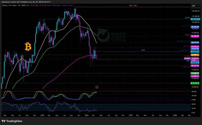 A Bitcoin 65,9 ezer dollárról indítja a hetet! Ahogy közeledünk a havi záráshoz, az eladási nyomás egyre intenzívebbé válik, amit jól mutat a medvezászló legutóbbi áttörése és a nemrégig támaszt nyújtó „MA-vonalak” elvesztése! Egyre valószínűbb egy újabb esés, és a bikáknak nincs sok helyük és idejük, hogy megtalálják a kőcsapkát vagy a gyufát, amivel meggyújthatják a Hopiumot, és tovább kereshessék a holt macska ugrását! Áprilisban ugráló viselkedésre lehet számítani, ami potenciálisan újraélesztheti a régi kriptós mondást: „sell in May and walk away”! 😇 🌊 🦄