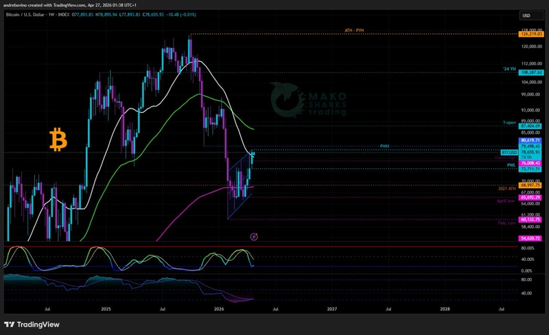 A medvék kávészünete a végéhez közeledik. Az általános kontextus továbbra is nekik kedvez, és ez a zöld április még mindig csapdának bizonyulhat, előkészítve a klasszikus „sell in May and walk away” forgatókönyvet. A medvék számára ideális esetben a BTC-nek 80 ezer alatt kell maradnia, és biztosítania kell a PWL 73,7 ezer alatti tiszta napi zárást, ami valószínűleg visszavinné az árat a heti 200 EMA-hoz, 68,7 ezerhez, és nyomás alá helyezné a 70 ezeres zónát. ☺️ ☕️ 🛠