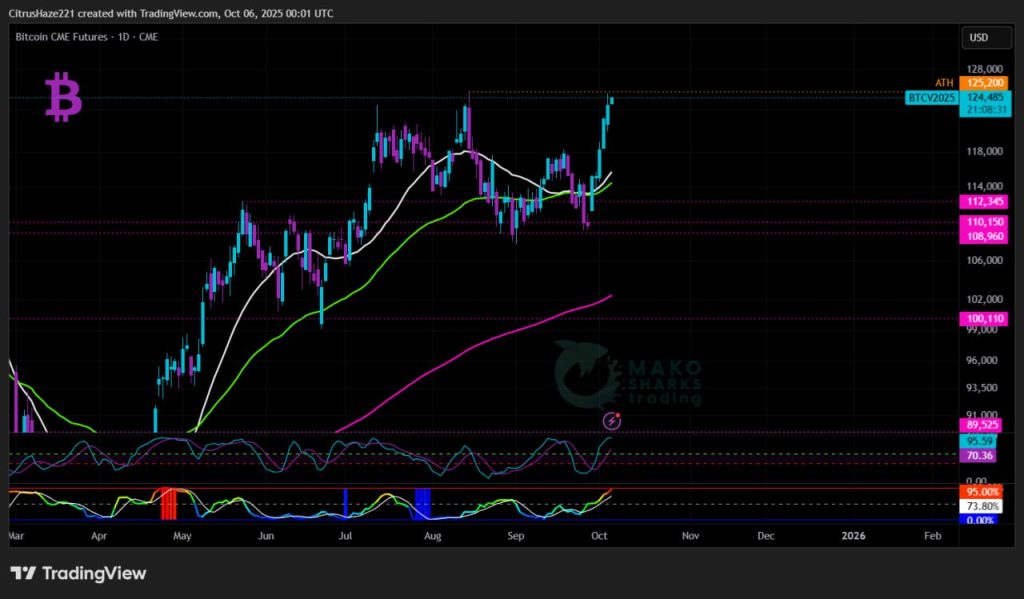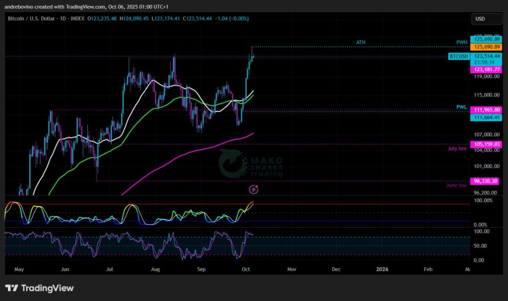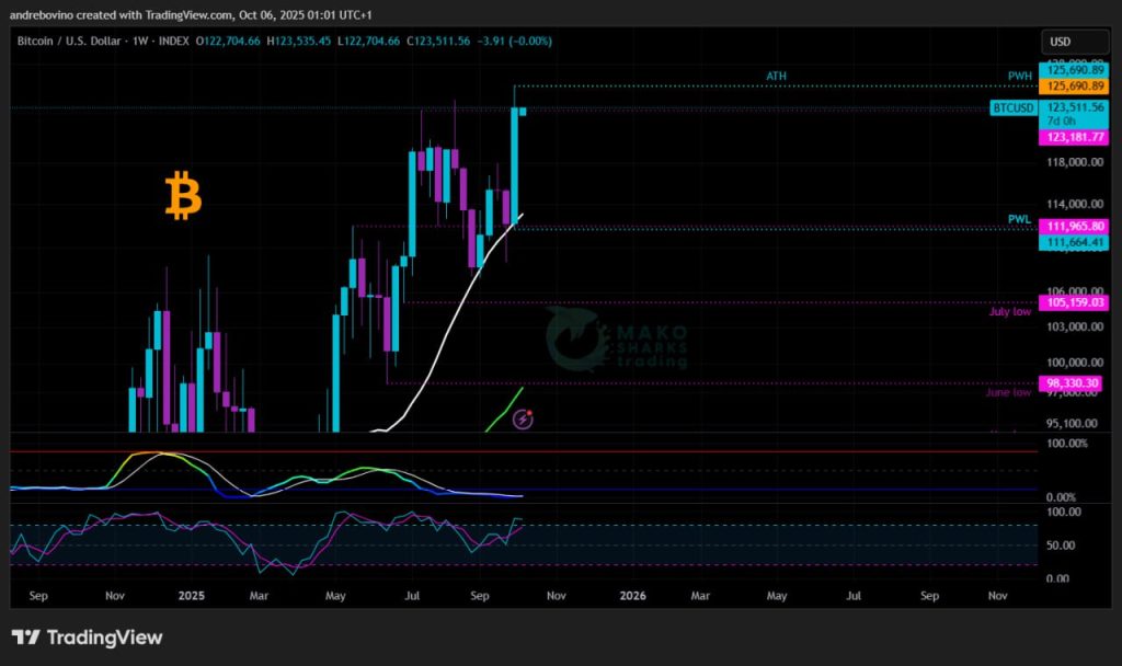 A Bitcoin heti nyitása 123,5k! Látunk-e folytatást új történelmi csúcs (ATH) és ár felfedezés irányába ezen a héten, vagy előbb egy kisebb korrekció következik, mielőtt újra a felfedezetlen területek felé indulhatna az ár? A medvék „csendben maradnak”, amíg a Bitcoin sikeresen kereskedik 111k felett napi zárás alapján! 🌜 💸 ↗️
