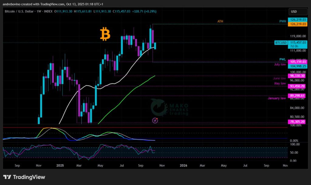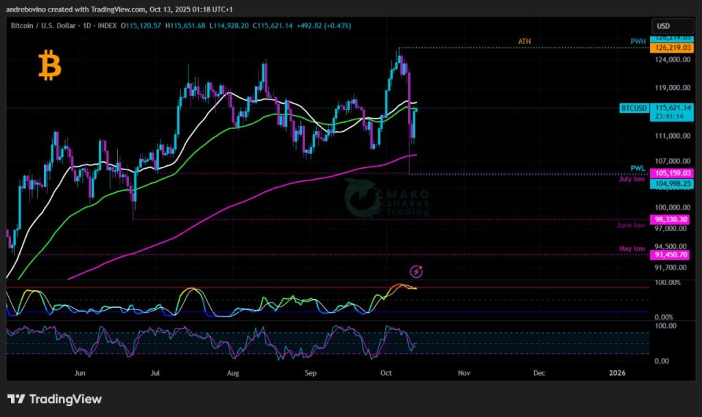 Bitcoin ezen a héten 115,1k-n kezd, miután a ciklus egyik legvadabb menetét tapasztalta: 17/20%-os esés, attól függően, hogy melyik tőzsdén, valamint egy hatalmas 19,14k B likvidáció, amely elmosta mind a túlzott tőkeáttételes bikákat, mind a türelmetlen medvéket. Pár nap alatt a tiszta eufóriából a nyers félelembe, most a piac egy kereszteződésnél áll. Képesek-e a bikák megvédeni a kulcsfontosságú 100k zónát és visszaszerezni a lendületet, vagy a medvék végleg eldöntik a következő nagy elmozdulást? 🌩 😈 🔪