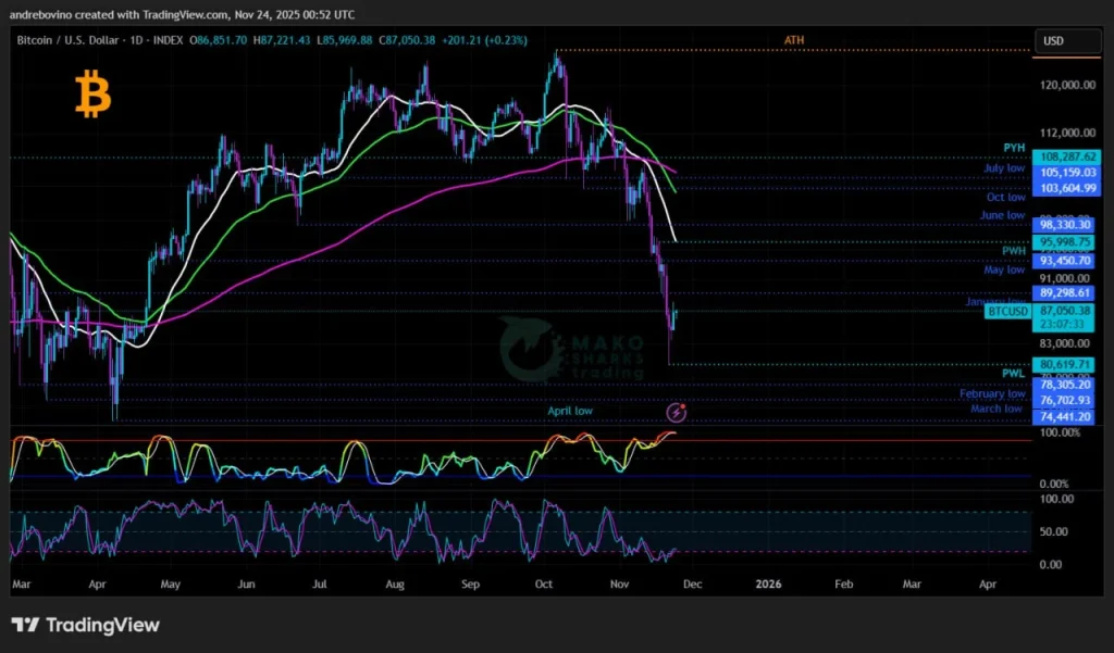 A jelenlegi helyzetet figyelembe véve nem hiszem, hogy a Bitcoin és a bikák meg tudják védeni az Előző Heti Aljat (PWL) 80,6k, így azt mondom, hogy a bikák számára az ideális forgatókönyv, ha sikeres napi zárást érnek el az Előző Heti Magas (PWH) 95,9k és a napi 21SMA 96k felett, ami közvetlenül vezet a heti 55EMA 98,3k kihívásához, amely jelenleg a fő akadály a 100k zónába történő potenciális folytatáshoz! Ne felejtsd el, hogy amíg a Bitcoin a bizonyos szintek alatt kereskedik, mint az Előző Év Magas (PYH) vagy a heti 21SMA 110,6k, minden visszapattanás pontosan az, visszapattanás, mielőtt továbbhaladna Mordorba! 😐 🤬 😭