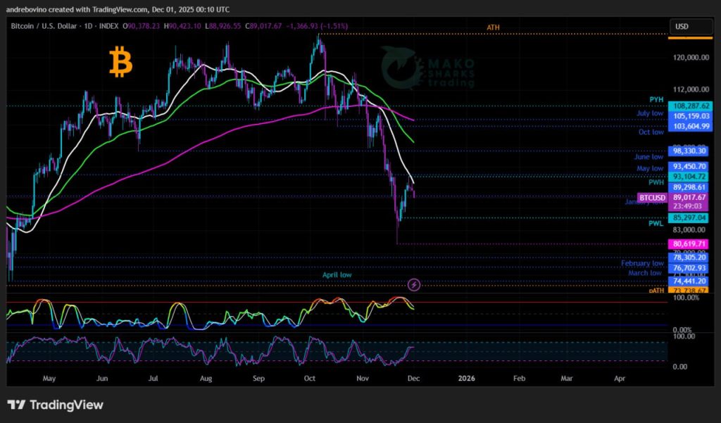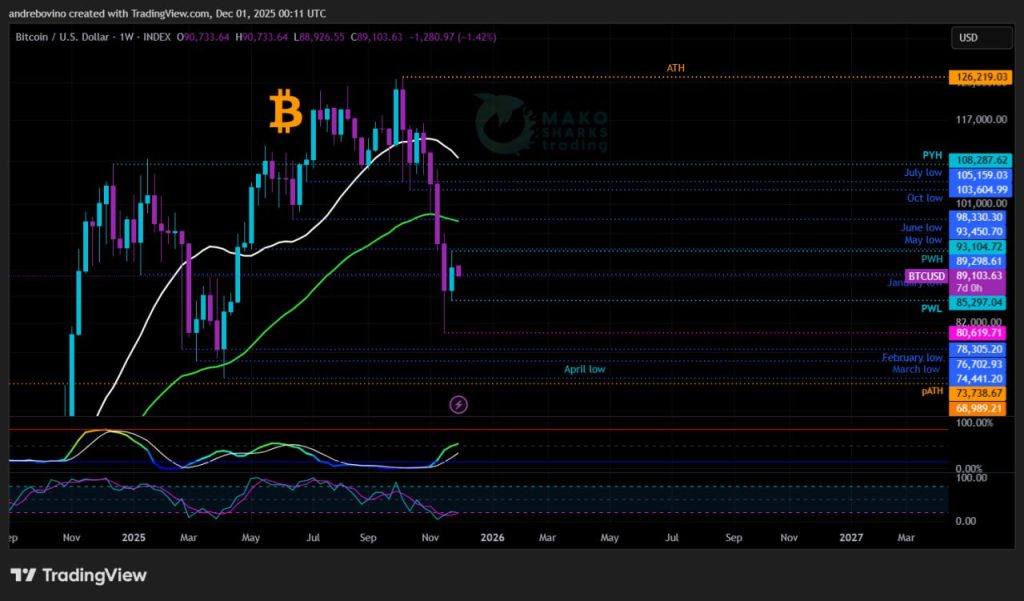 A Bitcoin a hetet 90,3k szinten indítja! Egyelőre BTC épphogy átszorul „Gollam barlangjain”, és a helyzet nagyjából változatlan a múlt héthez képest. A bikák ismét „vékony jégen” állnak a havi/heti zárások és nyitások körül.